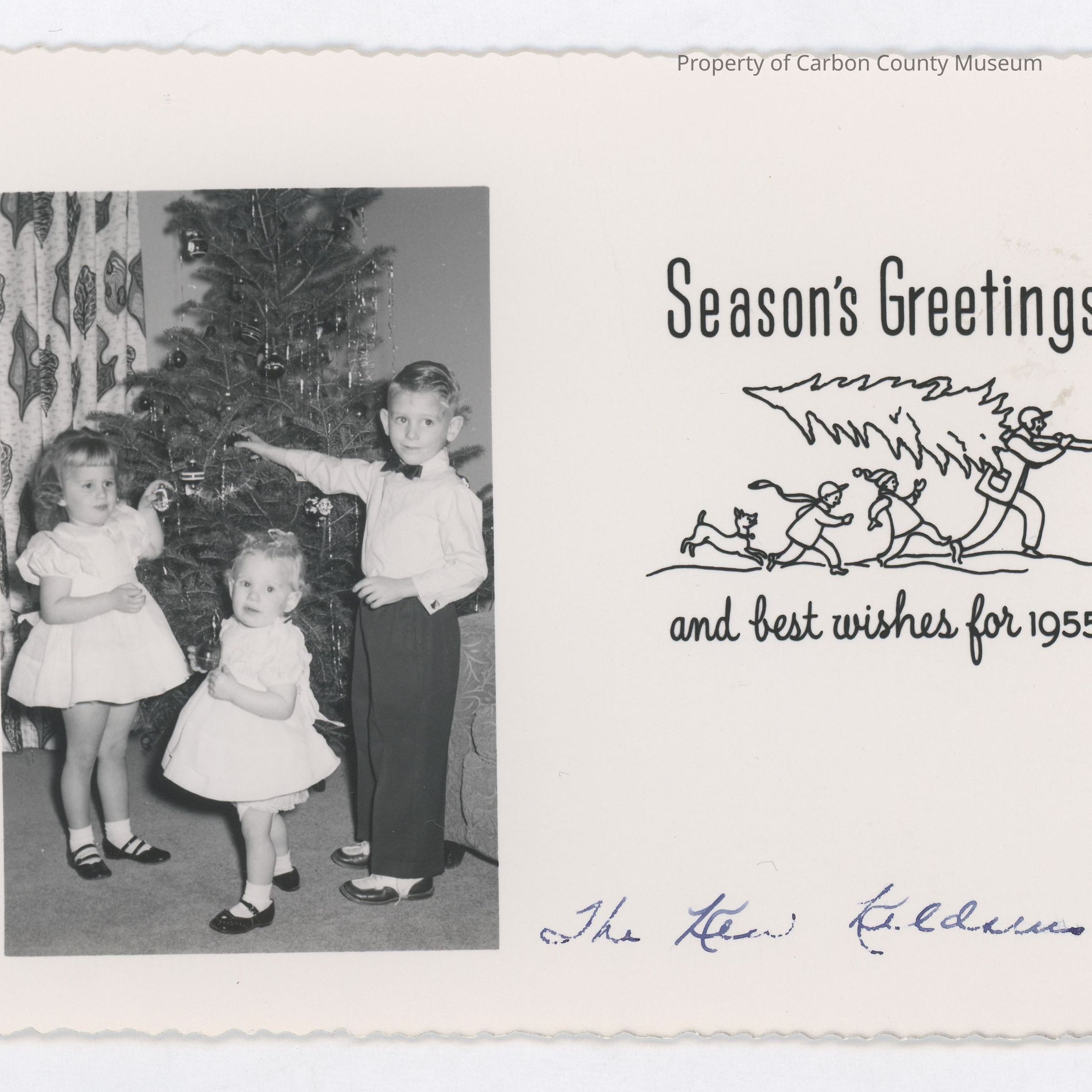Printed to image right in black: "Seasons's Greetings and best wishes for 1955" There is a drawing of a man carrying a Christmas tree followed by two children & a dog.