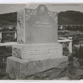 Black and white snapshot print of a grave headstone. It is three tiers with top ones smaller in size. On middle stone is "Bennett". On top marble looking stone engraving reads: "James A. Bennett Sep. 130, 1836. Jan. 22, 1906". Background is white low fence. Condition good. Wrinkled, creased, lower right corner torn.Collection