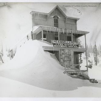 Update 2008: Black and white glossy reprint of the Kinsella Hotel, The Battle Rooming House in winter. The wooden hotel has two stories with a third front facade with the year 1900 in a small arch over the window under the apex of the top structure. The second floor has a center door and two windows on either side with a balcony porch across the entire width of the building. The focal point of the photo is a huge snow drift on the left side of the photo that is almost to the roof of the building with the snow drifting onto the second story balcony and front 1/2 bottom porch. Icicles are hanging off the roof edges on building side and front. Tall evergreen trees appear in background of hotel sides.