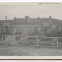Black and white print of rock house with 3 dormers and windows and two chimneys on roof. Either end of front has an entrance with white decorative posts to support a small porch root. Steps lead up to middle of house . A wood swing in yard on photo right. Out buildings on photo right and behind house is a hill. Wood frame fence with woven wire enclosure surround house .Flowers line fence on inside. Bushes and an evergreen tree are in the yard.