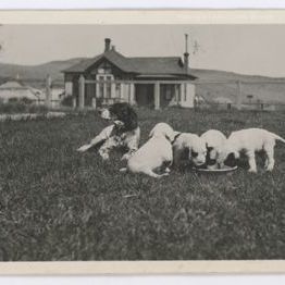 Black and white print on postcard paper. Image of a mother dog and four pups. Pups are white with brown spots and mother is a white with brown ears and liver spots. Three of the pups are at a feeding dish and one is walking away. The mother is laying on the lawn beside them. A house is in the background. Address in black ink to: "Mrs. W. C. France Fullerton, Calif." Written on back in black ink: "Dear Anna, Haven't heard from ... Walton." Postmark: "Rawlins Apr 25, 11 pm, Wyo. 1917". Printed in black on back: "Postcard" "Correspondence" "Name and Address". There is a green postage stamp with a profile of Jefferson. In white letters on stamp: "U.S. Postage 1 Cent 1". Condition good. Soiled, right edge faded, lower right edge creased.Collection