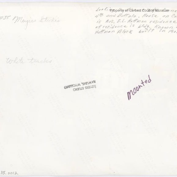 Written on back in pencil: "Looking Southeast to NW corner of 4th and Buffalo. house on corner is Mrs. E. L. Hoffman residence. South of residence is bldg known as Hoffman block built in 1902." "#35 Meyers Studio". "White Trucks". Printed on back in black ink: "Meyers Studio, Rawlins, Wyoming". "Mounted".
