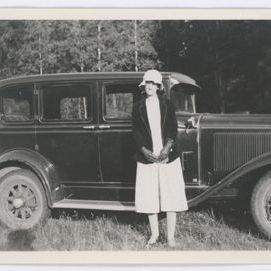 Black and white snapshot print of a woman standing beside a vintage car. the car has a back door that opens from the center back. It is long with enclosed top, spoke wheels, chrome radiator and shade on windshield. The woman is wearing a light colored dress, hat and socks and a dark jacket and gloves. Condition good. Soiled.Collection