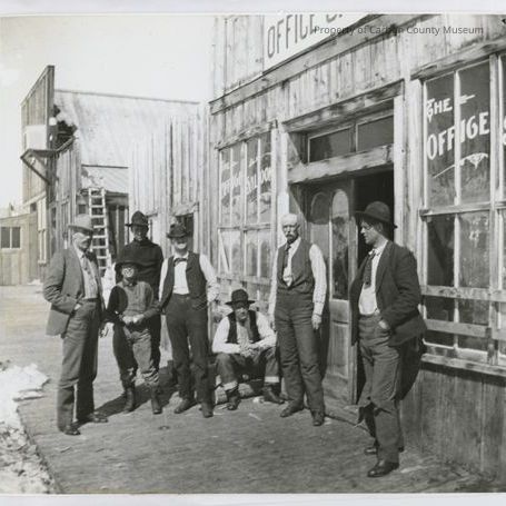 Update 2008: Glossy black and white reprint showing a group of five standing men and one boy, and one man seated on a small stack of short cut logs on a wooden sidewalk in front of a wooden building with the signs "The Office Saloon" printed across the windows in both sides of the doorway. There is a white sign with dark lettering attached above the doorway. All men and the boy have hats on except for an elderly gentleman standing in front of a closed door. The group are dressed in various attire. The men with light colored shirts are wearing ties of different lengths. There are other wooden structures appearing in the background to the left.