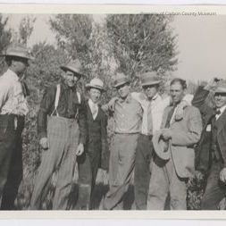Black and white snapshot print of seven men standing next to each other, some with arms over each others shoulders. They wear slacks, shirts and tires. Two have suspenders and three wear suits. Trees are in the background. Condition good. Slight soiling.Collection