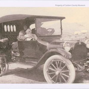 Note: Oscar Walgreen, standing left; Anna & August Nelson, Eva, the baby in car.