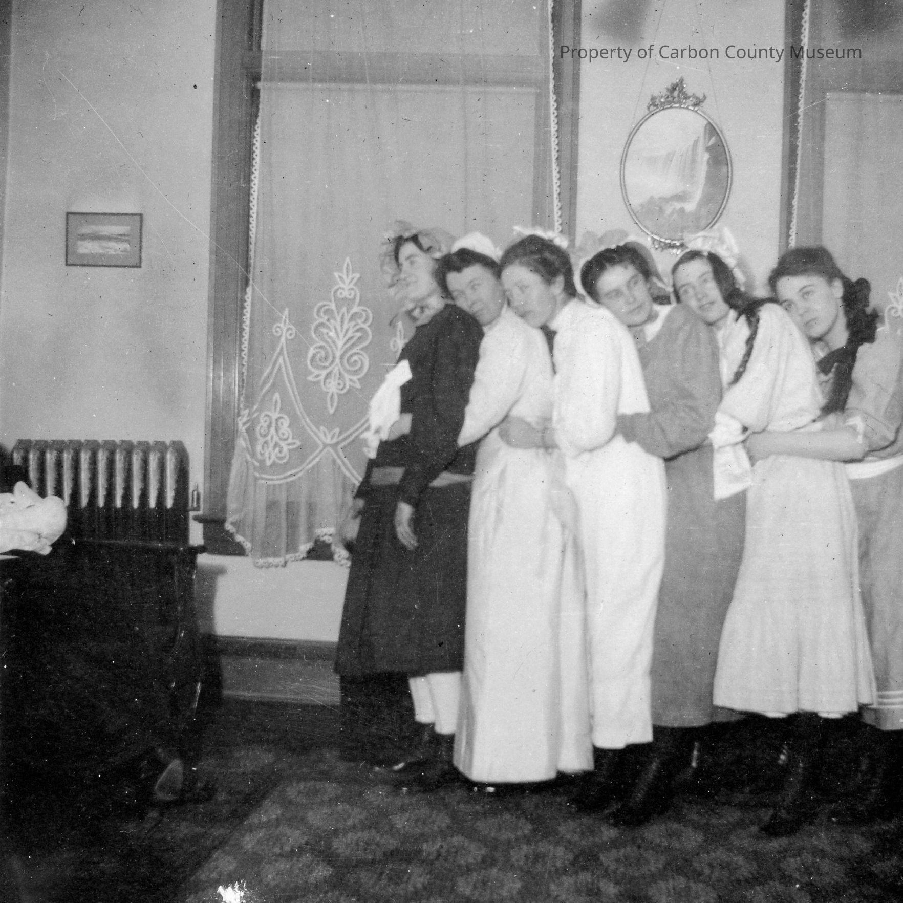 View 1: Women are standing in a line with left sides toward photographer and arms around waist of one in front of them. They are leaning forward toward photo left. Two tall windows are behind them and a heat radiator is on wall on photo left. Written on back in ink: "These are the pictures taken at our "Baby Party" before xmas." Condition good. Glue residue on back from previous mounting. Size 3 1/4 x 3 1/4.