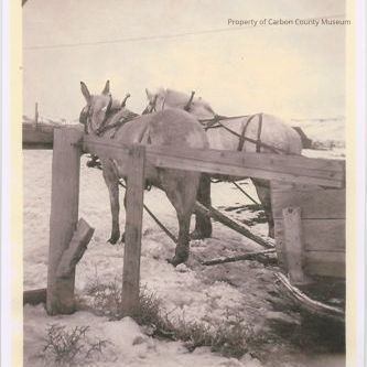 Black & white scanned copy print of team of mules, harnessed & hooked to wagon sled. They are standing with backs to photographer & on the other side of a chicken wire fence. Snow is on the ground & a corral can be seen in the distance.