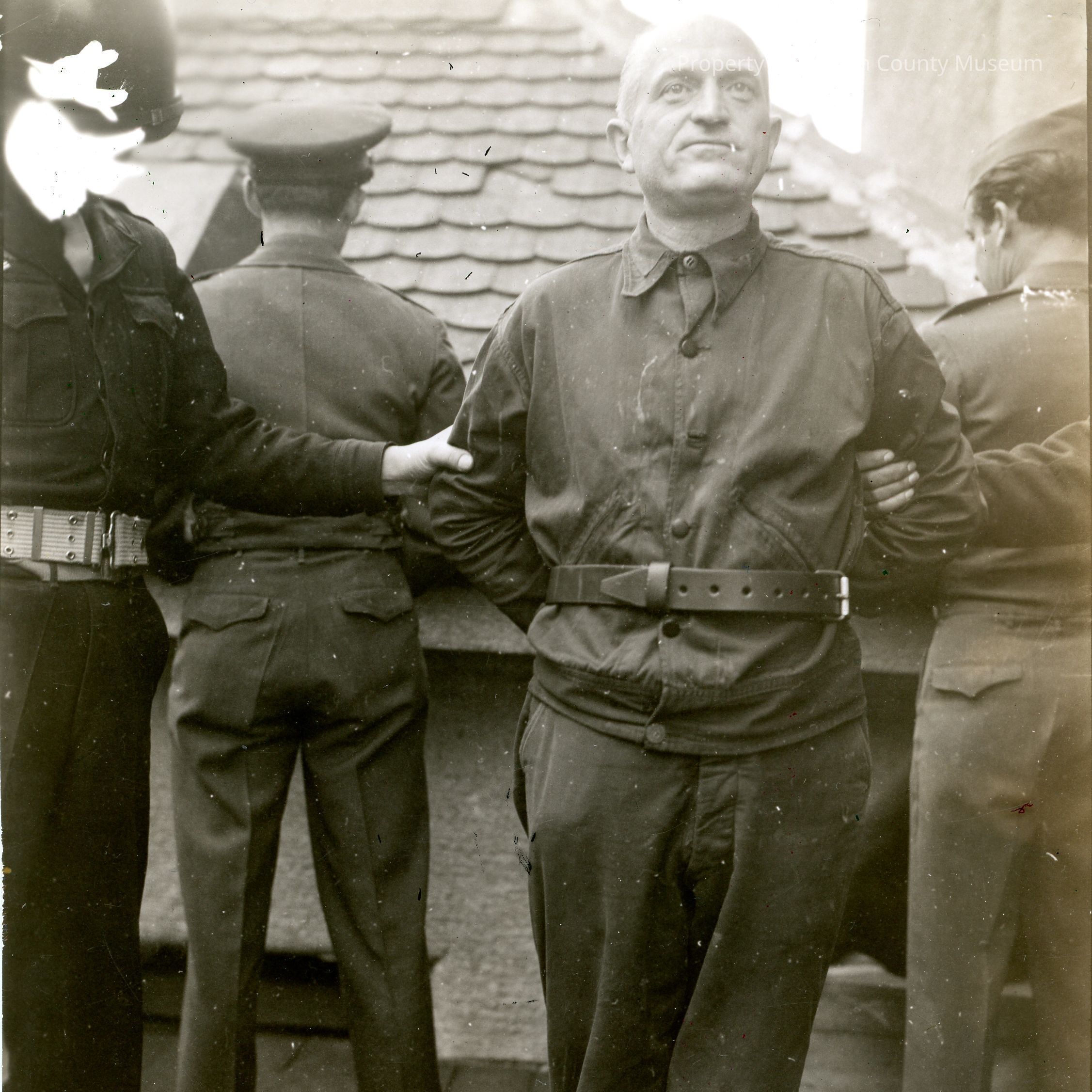 Black and white photograph. A man in a prisoner uniform is being held in place by two others, one is out of frame while the other is wearing a military uniform and has his face scratched out. Behind the three are two men wearing military uniforms with their backs to the camera. Text printed on the back of the photo reads "Bollow, Wilhelm Exec WCPL 5 Nov 48".