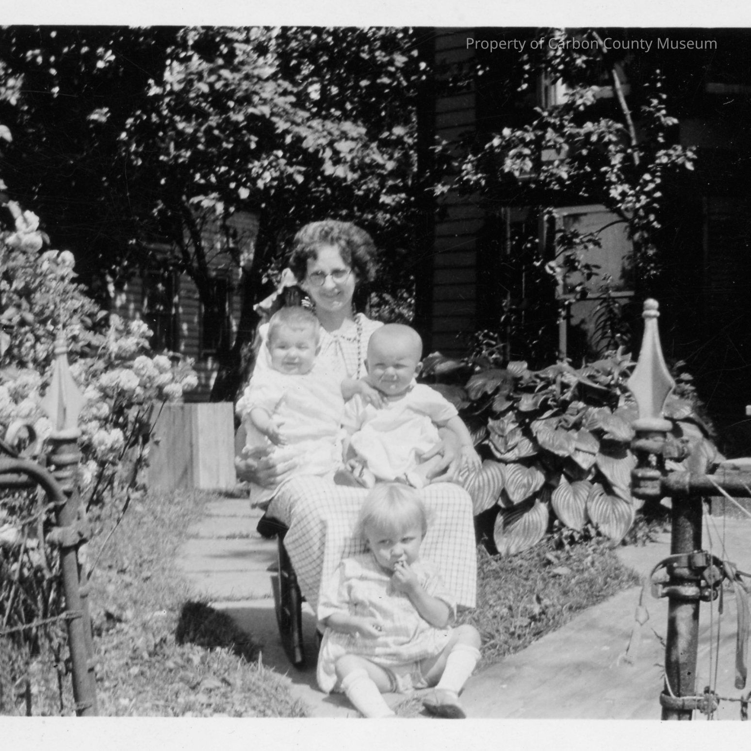 Written on back in pencil: "Stella Knaffenberger and grandchildren." Condition good. Soiled, creased, fingerprint, scratches.Collection