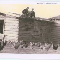 Black & white scanned copy print of two men on top of a log building. The building is "L" shaped & has a door on photo right section. Three rectangular windows are visible. Men are sitting with knees bent & feet on roof. One leg is dangling from roof. There are chickens on the ground in photo foreground.