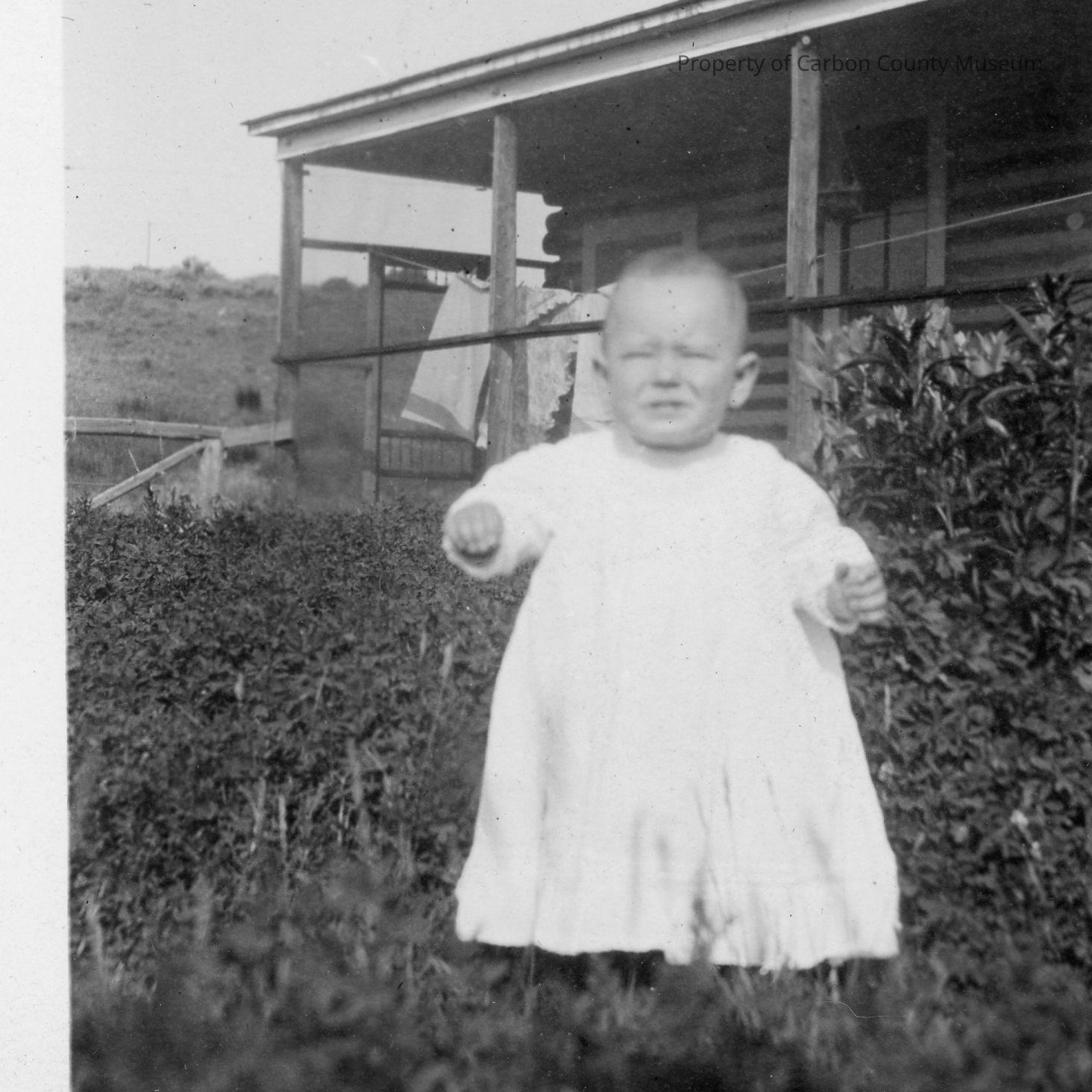 Black and white snapshot print of toddler in white dress. He is standing in grass in front of a log house with an open covered porch. Written on back in pencil: "Bennett".Collection