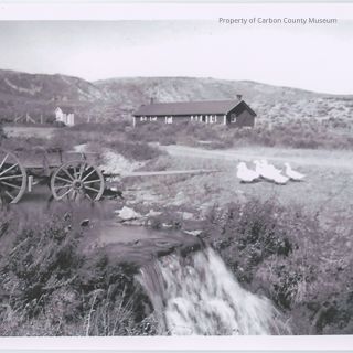 Black & white scanned copy print. Image of a wood spoke & wheel wagon, setting in a creek. A small water fall is in foreground. On photo left is partial view of two story ranch house. A privy is in photo center & a bunk house on photo right. Some white ducks are between creek & a dirt road leading to the house.