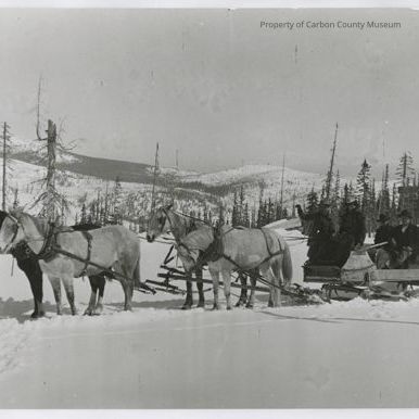 Update 2008: Black and white photo reprint of a bleak winter scene in which a 4-horse team (1 maybe a mule) is pulling a wooden wagon sled with a man and a woman in the front of the sled and another man and woman in the back seat of the sled. The lead team is composed of a dark horse and possibly a white mule. The second team are two white horses. The people are dressed in dark clothing. The man in back is wearing a light colored shirt. All are wearing hats. There is an electrical pole with insulators in the right foreground of photo with two wires showing across entire photo to the left side. The pole is buried in deep snow and only the top portion is above snow-line. There appear to be many dead evergreen trees in the background as well as healthy ones at the center skyline.
