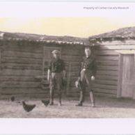 Black & white scanned print. Image of two men standing in front of an "L" shaped log building. They are wearing dark colored shirts, medium colored trousers & tall boots. Man on left is wearing a hat & man on right is holding a hat in his right hand with arm extended down toward his knee. Building looks to have a sod roof, doors on end and inside "L" shape and rectangular windows. Chickens are on ground beside building.