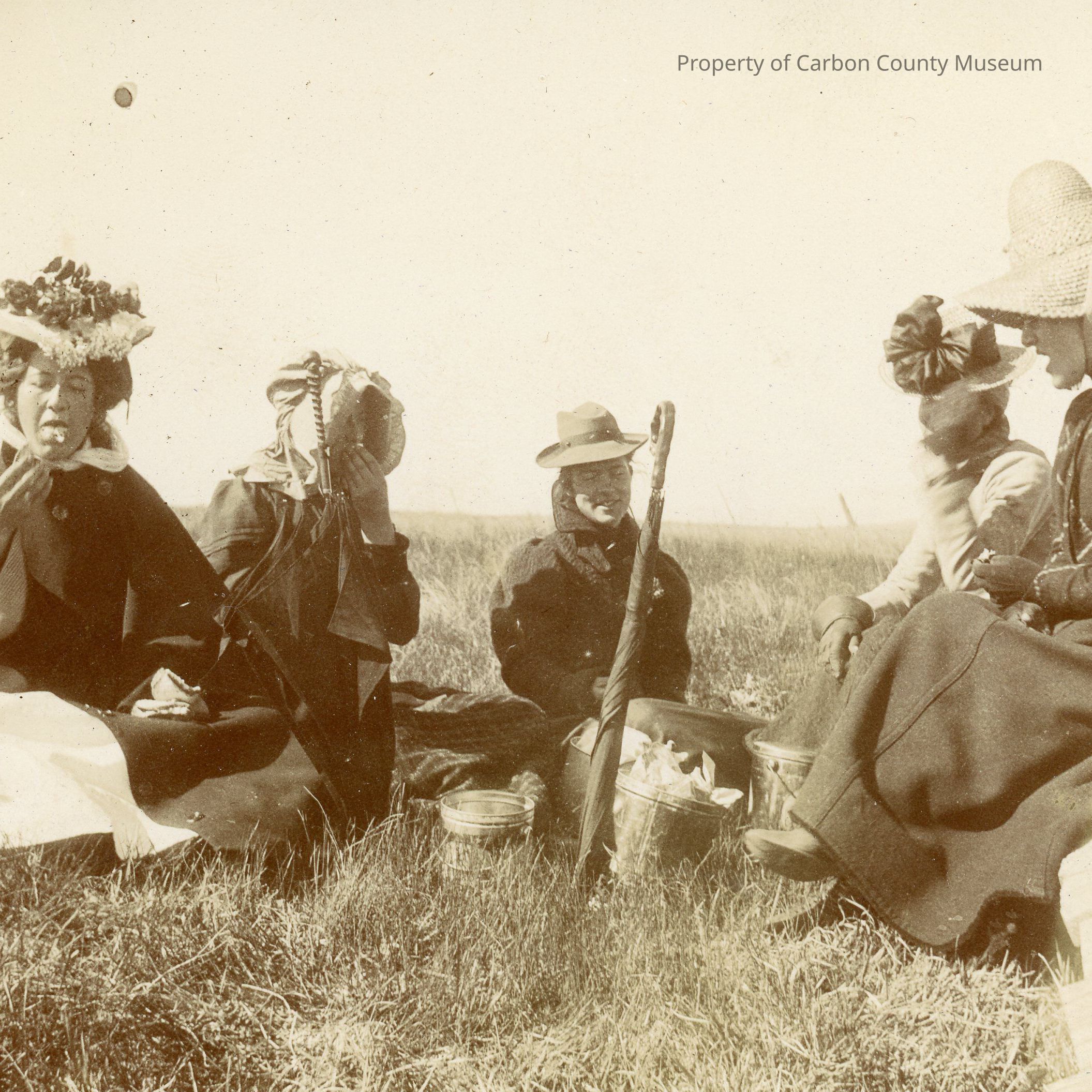 Sepia print of five women seated outside on prairie grass. They are eating. Pails are on the ground between them. The women are dressed in heavy clothing. Some have capes or coats and all have hats. The handle ends of two umbrellas are beside two women. Condition good. Creased, wrinkled, curled, scratched.Collection