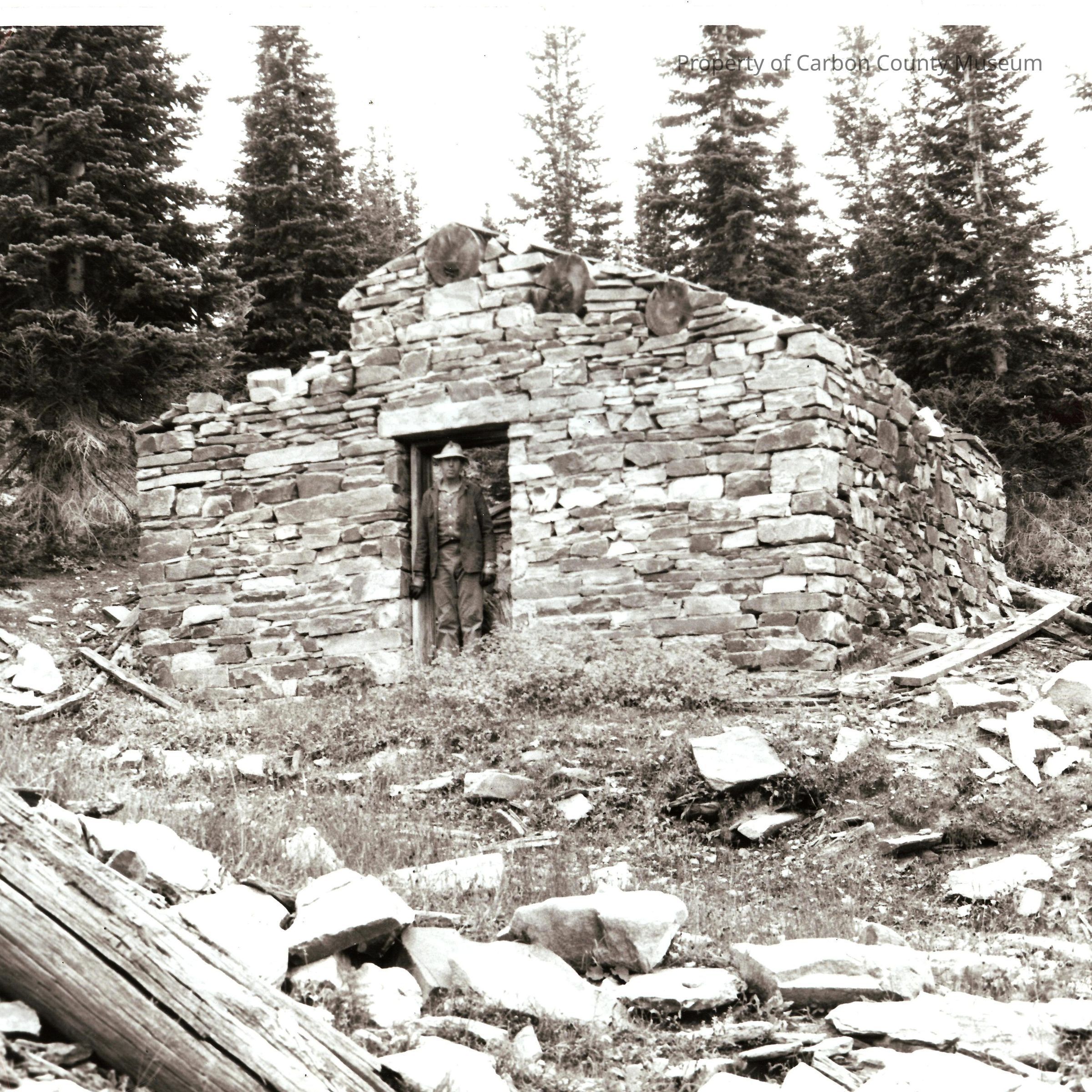 Update 5/2010: Black and white glossy print of a stone building with large log rafters at roof top. the roof on photo left has caved in and the side walls are deteriorating . A man stands in a doorway in the center of the end of the building. A large stone is overhead in the doorway and a wood door is open. Building is on a slope with pine trees in the background and rocky ground and timbers surrounding.