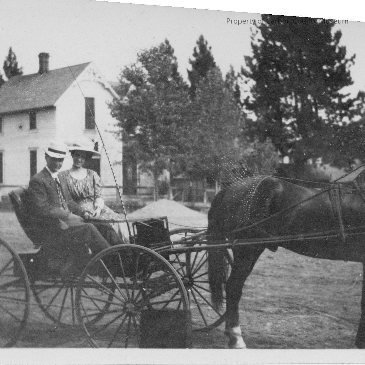 Black and white print of a man and woman sitting in a buggy. It is pulled by a single dark horse. In the background is a white, two story house. Large trees are beside and behind the house. Written in pencil on back: "12". Condition good. Soiled.Collection