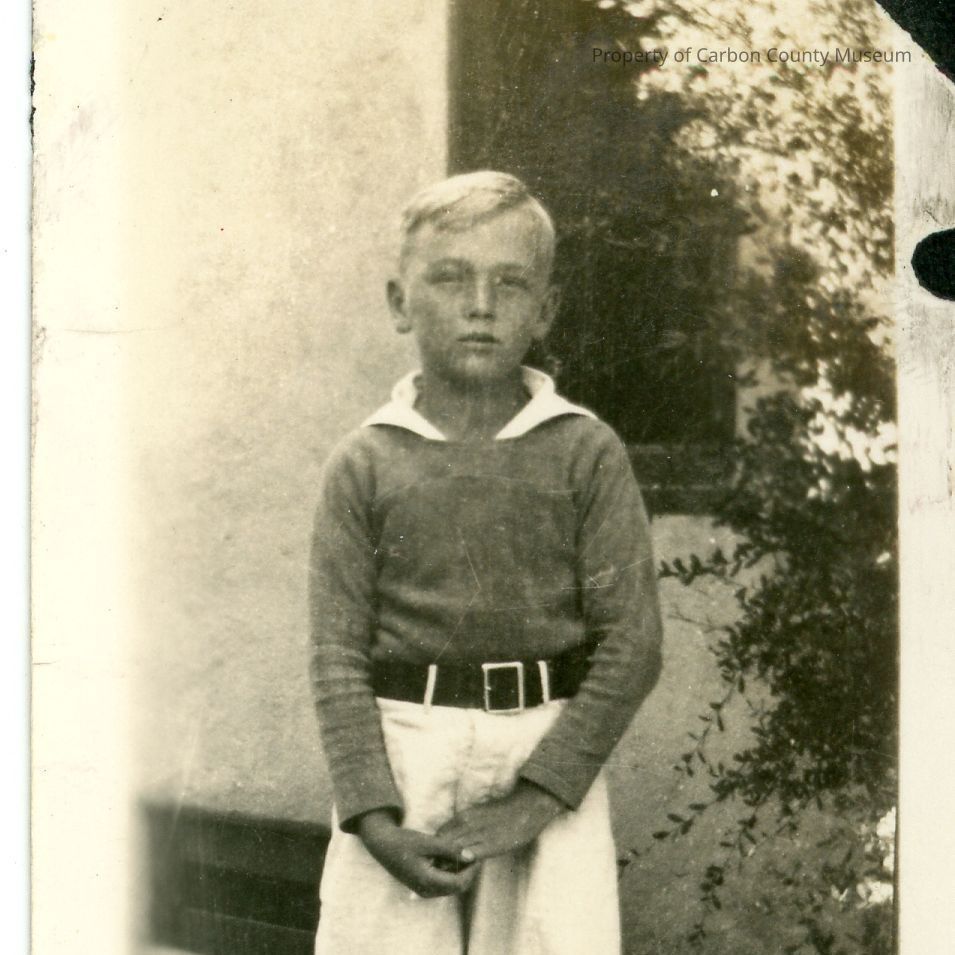 Small black and white photograph. A young boy is standing on the sidewalk beside a large plant. Written on the bottom edge is "BOBBY CLARK 5/15", other writing is too small to read unassisted. Written on the back is "grandson of Arthur Huntington", the number 344 is also printed.Collection