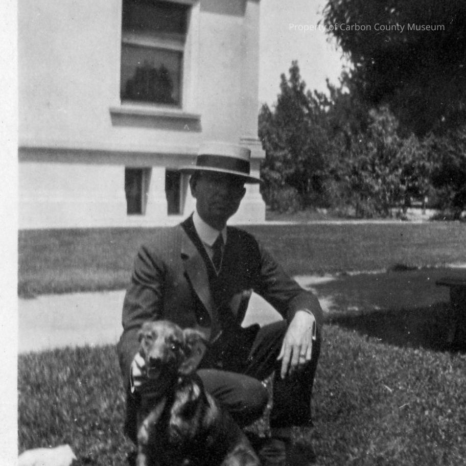 View 2: Man kneeling on lawn in front of a multi-level building. He wears a dark suit and flat brimmed straw hat. There is a dog sitting in front of him. Written on back in pencil: "Someones dog and Fred Library at Santa Maria in background No. 3". Condition good. Wrinkled, curled, soiled.