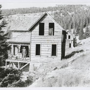 Update - June 2010: Black & white glossy print. Image shows a man standing on the second story porch of a planked wooden three story structure with paneless open windows; roof with many missing shingles. Building is built into the side of a hill at side right. Another wooden two story building is seen at background. A large evergreen tree is at foreground left & dormant grass is at foreground right. Other evergreens are seen on hillside in background. Boulders serve as support wall at side right of house.