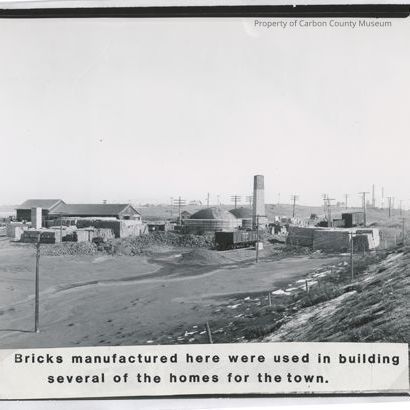 Update February 2011: Black & white glossy contact print. Image of a manufacturing yard, there are two dome top, round structures & a tall brick chimney looking structure in photo center. A long dark building with dark roof is on photo left behind several large piles of brick. More piles of brick & railroad cars are on photo right. Some small sheds & another building are seen within the yard. In the distance roofs of houses are seen on photo left. On photo right are tall round smoke stacks & the top of a Spanish style twin peaked building. High line poles are on both sides of the yard. A vintage car is driving away from yard on a dirt road. Several men are within the yard working. A white paper is attached to the bottom reading: "Bricks manufactured here were used in building several of the homes for the town".