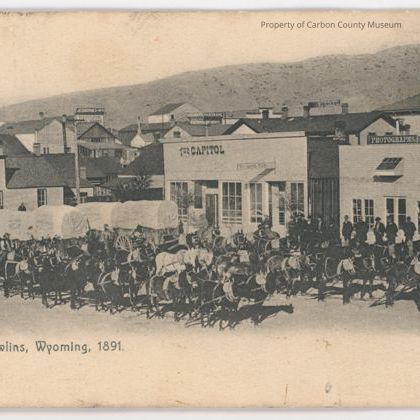 Black & white print card of rows of covered wagons with teams of mules pulling them. The wagons were owned by "Wyoming Transportation Co" and hauled freight. Businesses line the street & visible signs are "The Capitol" "The Bon Ton" "Photographs" & "Saloon"