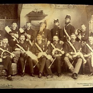 Black & white, Sepia print and three copies of a group of 14 men. Printed on tan backing. Back row is standing & front row is seated. All are dressed in dark matching suits. All but two in center back have a white sash from right shoulder to left waist, with a cross at center. Some men have on medals & all hold or are wearing hats with feathers, called fore & aft or bi-corns. All men have mustaches or full beards & front row have decorative swords across their legs. Group are Masons in full uniform. Printed on bottom of mat in black letters: Two Doors North of Post Office, UpStairs, Laramie, Wyoming. Signed in black ink on left bottom of mat: Hartwell & Son. Men are identified from same photo in collection (1947.003.0462). Back row L to R: 1. Russell Austin; 2. John Osborne; 3. unknown; 4. William Ash; 5. W. H. smith; 6. John Graff; 7. D. C. Kelley; and 8. Robert Galbraith. Front Row seated L to R: 1. Fred Palmer; 2. James Rumsey; 3. Newt Rankin; 4. Perry Smith; 5. William Daley Sr.; 6. unknown. Could be Jesse Knight. Boyd Kirk was crossed off other photo. Size 10 x 14 for original. Two copies are 11 x 17 inches.