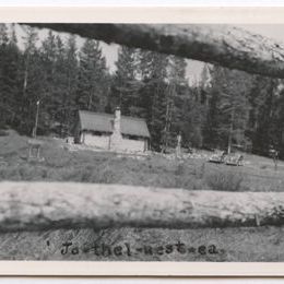 Update 2012: Black and white card. Image of a cabin, seen through a pole fence. Cabin is log and has a steep roof, rock fireplace in center of side and high windows. Tall evergreen trees are behind and two vintage cars are parked at the end of the cabin. The bark is still on the poles of fence in the foreground.