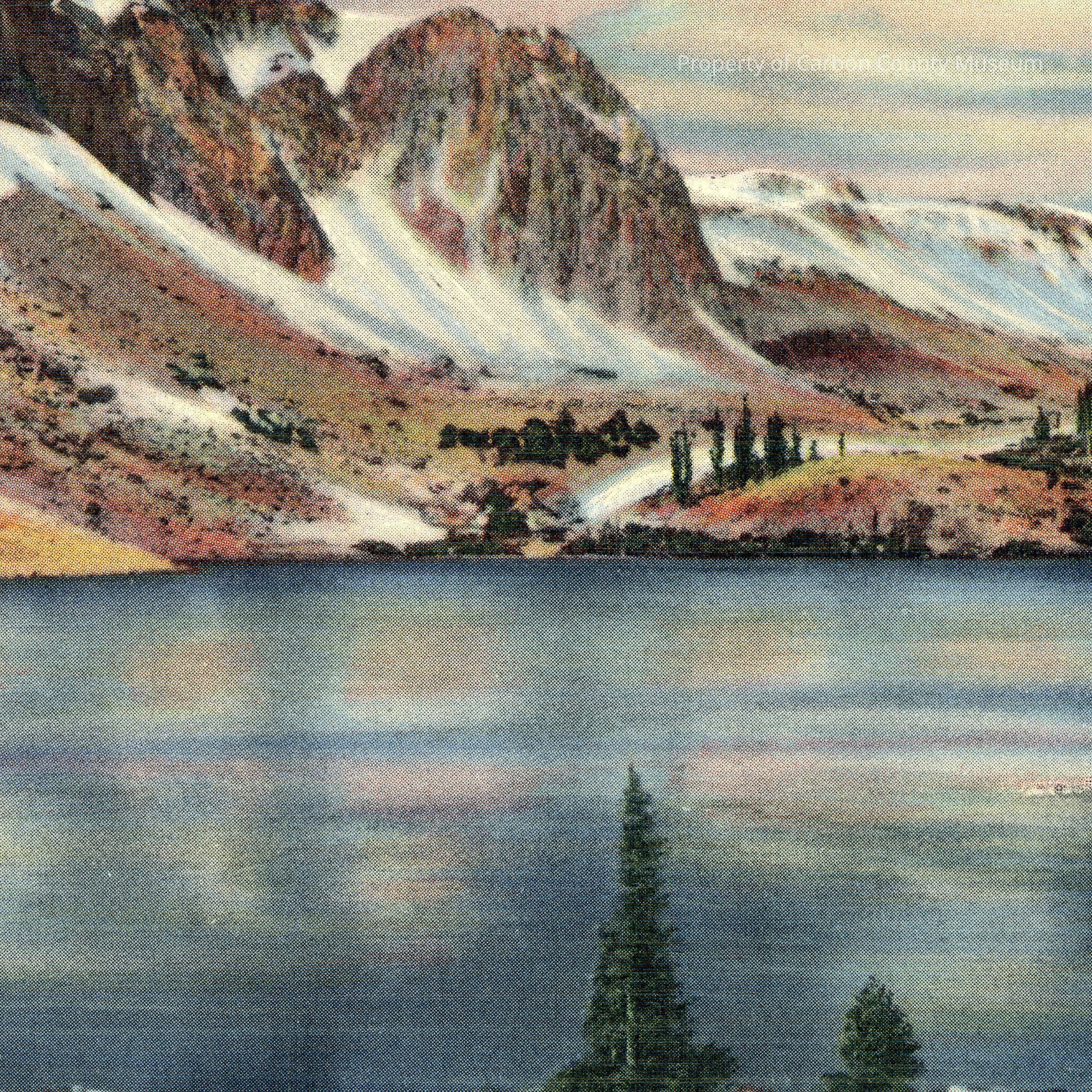 Update 2012: Color enhanced card. Image of a lake in the foreground and a steep cliff behind with snow in the crevices. Evergreen trees are around the lake in scattered sparse lines. Printed on the back in blue: "1085 Lake Marie, Snowy Range, Medicine Bow National Forest In Southern Wyoming." "POST CARD". In rectangle box: "Place one cent stamp here". Written in green ink:" Jungquist". Condition good.Collection