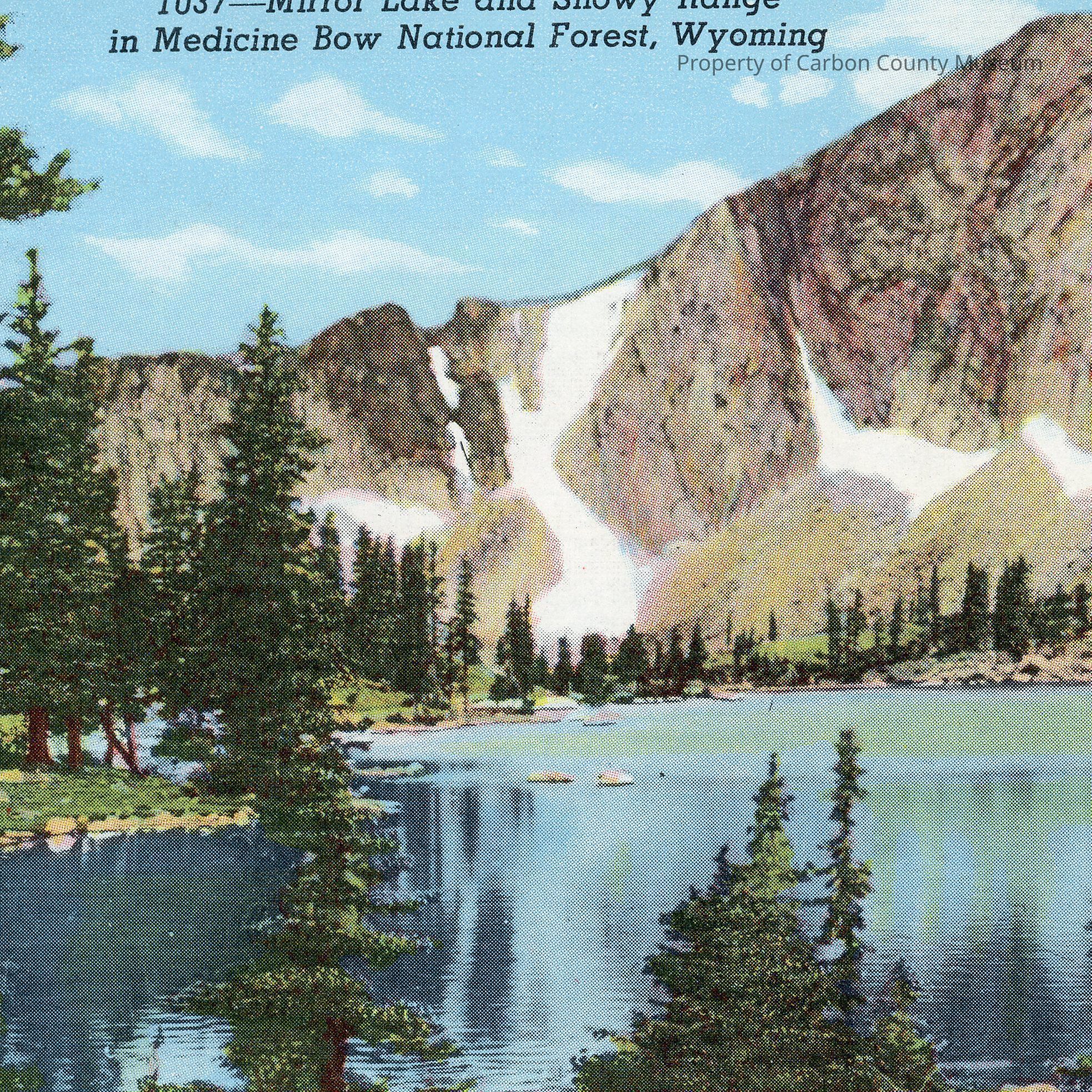 Color enhanced card. Image of a lake in the foreground surrounded by evergreen trees, grass and rocks. A steep, sheer rock rises up behind. Printed on card top: "1037 Mirror Lake and Snowy Range in Medicine Bow National Forest, Wyoming".