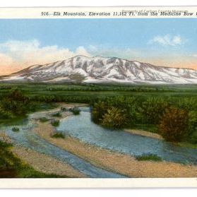Color enhanced photo. Image of a monolithic rock in three sections. Mountains are in the distance and a stream runs in front. A highway is on card left of rock.