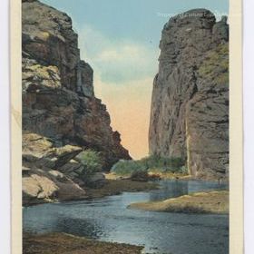 Printed on back in blue: "Devil's Gate. this landmark of the Old Oregon and Overland Trails is one of the interesting sights to the modern traveler on highway 87E. It is a narrow cleft cut through the hills by the Sweetwater and stands within a few hundred feet of the highway which goes around, not thru it." "POST CARD" " This Space For Address Only" In rectangle: "Place One Cent Stamp Here." In green ink: "Heath Nelson Collection-L.J. Nelson". Condition good.Collection