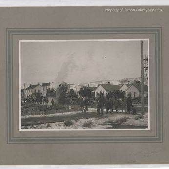 Black & white print on grey mat with dark grey trim. In bottom right corner: The Ferris Studio Rawlins, WYO." Image of a parade on 400 block of Buffalo Street. There is a steam tractor spewing steam. Tractor is pulling three wagons; the first one is tall, wood sided. There is a band with drums, tubs & various musical instruments riding on first & second wagons. On third wagon men in dark suits are standing. Wagons have wood spoke wheels. Multi-level buildings on photo right. One reads: "Cliff House". Residence are behind parade on photo right. In foreground, street is lined with people watching. A yard surrounded by a low fence is filled with barrels. A small amount of snow is on the ground & a dusting on the hills in photo background.