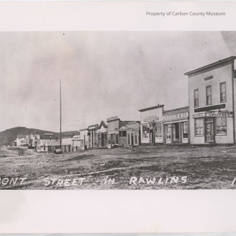 Written on bottom in white on original negative "FRONT STREET IN RAWLINS 128".