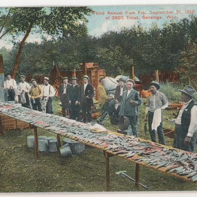Printed across the top in red: "Third annual Fish Fry, Sept. 21, 1910 of 3,920 trout, Saratoga, Wyo."