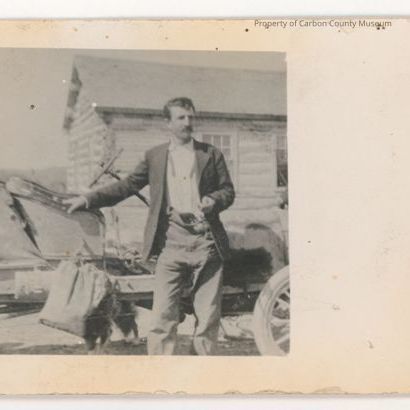 Update 2012: Black and white card. Image of a man standing beside a vintage, open top car with his right hand on the seat. Behind him is a log house. The man has dark hair and a mustache.