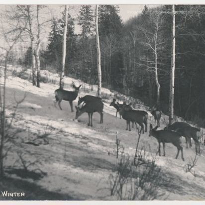 Update 2012: Black and white card. Image of approximately 15 deer on a snowy slope. In front of them are bushes and behind some bare aspen trees and evergreen trees in the distance.