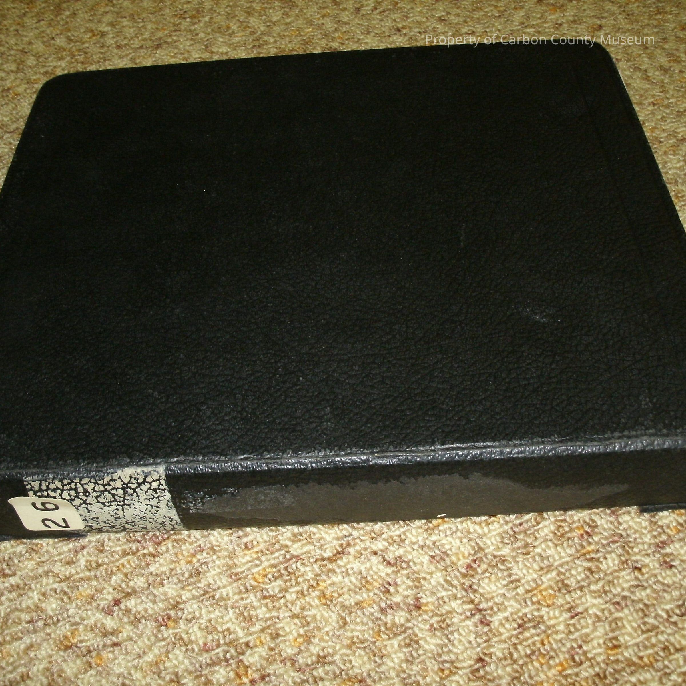 A dark brown, leatherette, three ring Favorite brand looseleaf binder with No. 26 on a tiny white sticker on upper outer spine. Measures 11 3/8" x 10." Inside front cover are three white stickers with the smallest marked G-2, and the largest has Morris Larsen Frandsen written in black ink. Contents include cabinet cards, photographic prints of friends and family from 1890-1960's.
