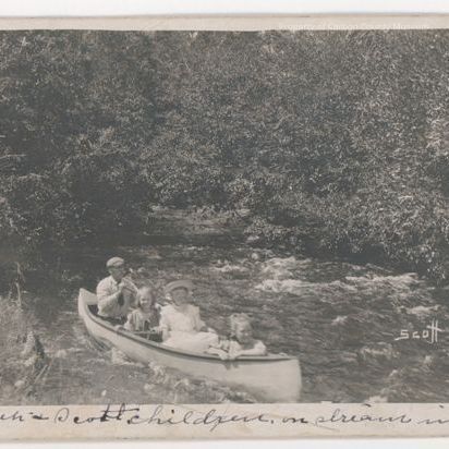 Update 2012: Black and white card. Image of a light colored row boat floating down a stream. A man seated in back holds an oar. He wears a cap and has a light colored mustache. Three young girls are seated in a row toward the front of the boat. The one in the center wears a hat. Trees and bushes line the banks of the stream, water is bubbling over rocks and splashing up at bottom of the boat.
