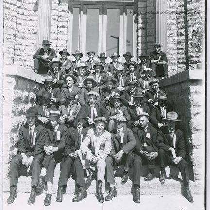 Update - May 2010: Black & white glossy contact print. Image shows five rows of men sitting on steps to a large sandstone building. There are tall glass (with wood frames) doors at top of stairs. Grecian columns are seen side left & right of doors.