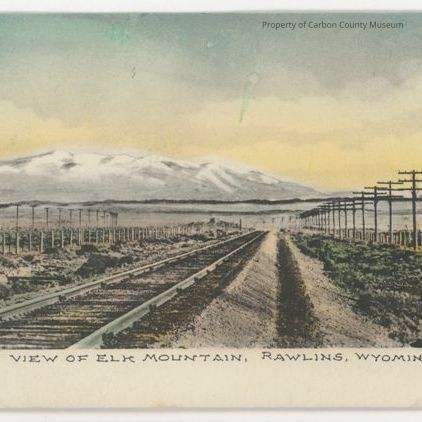 Printed across bottom border in black: "View of Elk Mountain, Rawlins, Wyoming".