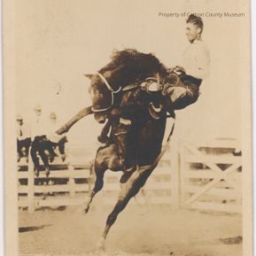 Sepia Card. Image of a cowboy on a bucking bronc. The horses front feet are in the air with neck arched, head down and one back foot on the ground. The cowboy is off to one side holding on with his left hand and his right arm is raised with his hat held in his hand. He seems to be smiling. a corral fence and gate are in the background. Cowboys are sitting on the fence.