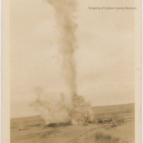 Sepia card. Image of a plume of smoke rising straight into the air. A wider smoke area is nearer the ground. Some debris possibly from an explosion is on the ground at the base of the smoke. One item is possibly a large gear wheel and a smaller one on card right.