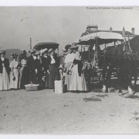 Update - June 2010: Black & white copy print of a group of women dressed in vintage clothing & a man standing in a roadway with two horse drawn covered buggies to their left. A wicker picnic basket & a sack are sitting on the ground near the people. A dirt area is at foreground. Old courthouse is at background right.