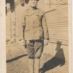 Sepia Card. Image of a soldier in uniform. He wears a flat brim hat, wool jacket, jodhpurs, gaiters and laced up shoes. He stands outside next to a clapboard building.