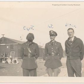 Part of collection of Civilian Conservation Corp photos. Black and white snapshot print. Image of three men, two in uniform, standing outside. the two on photo left have on dark, belted jackets with medals on the lapels. They both wear hats but of different styles. Man on far left wears dark slacks and man in middle wears jodhpurs. The man on far right has glasses and wears a dark short waist jacket with shawl collar and dark slacks. Behind them in the distance is a wood building with debris at the end.