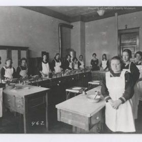 Update February 2011: Black & white copy of 15 girls around a mock kitchen counter. There are drawers in the counter units in front of the girls, bowls, utensil, & a burner on top of counter. Girls are wearing white over the shoulder aprons. The teacher at center back has on a black dress with "V" shaped pattern collar. On left back wall is a four door cabinet & cook stove with pipe going up & into wall. A tall wood door & clock are on right back wall.