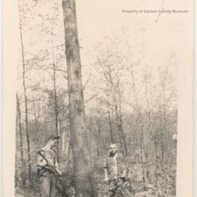 Part of collection of Civilian Conservation Corp photos. Black and white snapshot print. Image of two men standing next to a tree. Each man holds an ax in his hands. Other smaller trees surround them. The man on photo left is shirtless but wears a baseball cap and dark pants. The man on print right wears an unbuttoned shirt and pants.