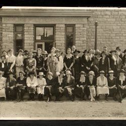 Written on back in black ink: "4. Bess Sherman 5. Lillian Toole Rendle 15. Mary Draper 12. Miss Gary 19. Winifred Hanna 12. Amy Whitston 21. Ruth Budd Larsen 22. Mrs. Ekdahl 31. Emmett McGray 35. Clare 37. Sis Frandsen 38. Mr. Coleman, principal 40. Peg O'Neil 42. Mrs. Shaw 43. Angela Hurley 46. Helen Otis 48. Joan Schoonberg Murray 51. Edna Verplugh 53. Josephine Phelan 55. Frances Smith 57. Bess Bowles"